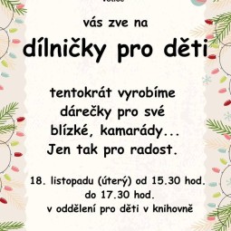 🎄 Dílničky pro děti – 18. 11. od 15:30 do 17:30 v dětském oddělení knihovny. Tvoření malých dárečků pro radost.
