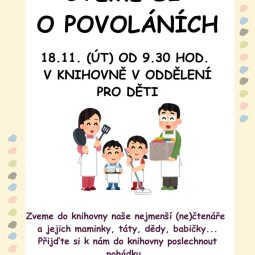 📚 Čteme si o povoláních – 18. 11. od 9:30 v dětském oddělení knihovny. Pohádka a tvoření pro děti.
