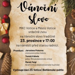 MKC Votice a Město Votice zvou na tradiční Vánoční slovo, které se uskuteční v pondělí 23. prosince od 17:00 na náměstí před starou radnicí ve Voticích. Součástí programu je vystoupení žáků ZŠ Votice a Betlémské světlo.